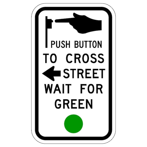 PushButton Cross Street Wait < 09X15 Diamond Grade Cubed Reflective .063 Aluminum Thickness - Sign Spec's: MUTCD:, R10-4AL, Sign Category:, Regulatory, Header/Legend:, PushButton Cross Street Wait Left Arrow , Legend, Text Color:, Black & Green, Background Color:, White, Aluminum Grade & Temper:, 5052-H38, Hole Punch Pattern:, Federal Punch: 2 Holes T&B Centered, 1.5 inset, Hole Diameter: 7/16 , Hole Punch Shape:, Round, Radius Corners: , 1.5