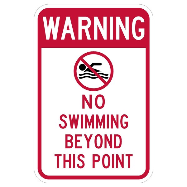 Warning No Swimming Beyond 12X18 Diamond Grade Cubed Reflective .100 Aluminum Thickness - Sign Spec's: MUTCD:, CUS00085, Sign Category:, Specialty, Header/Legend:, Warning No Swimming Beyond, Legend, Text Color:, Black & Red, Background Color:, White , Aluminum Grade & Temper:, 5052-H38, Hole Punch Pattern:, Federal Punch: 2 Holes T&B Centered, 1.5 inset, Hole Diameter: 7/16 , Hole Punch Shape:, Round, Radius Corners: , 1.5