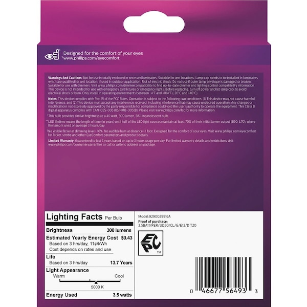 This Ultra Definition dimmable bulb is both comfortable for your eyes and enhances the way you see colors around you. With a high color rendering index (CRI) comparable to natural light you can enjoy full- spectrum soft white light that brings out the true colors of your home. Meets strict criteria for EyeComfort a standard developed to measure products against a set of key factors that can impact the comfort of your eyes. All packaging contains on average more than 8% recycled paper and will further decrease. Dimmable warm glow effect enabling light levels to dim to the warm tones of traditional bulbs.