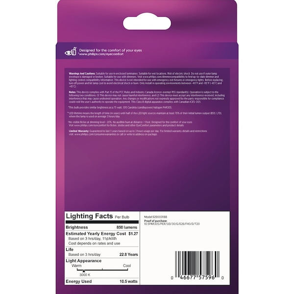 Ultra Definition LED (light emitting diode) PAR30S dimmable light bulb. Specifically designed to provide high quality natural light that helps you see better. Enjoy comfortable full-spectrum light that brings out the true colors and textures of your home. Philips EyeComfort LED bulbs are designed to be comfortable on your eyes with no visible flicker or glare. Energy-saving products with plastic-free packaging. Dims to a cozy warm glow just like traditional incandescent bulbs. Get the look and feel of traditional glass incandescent bulbs with the energy-efficient performance of LED. CRI (Color Rendering Index) 95.