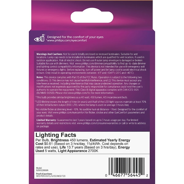 Ultra Definition LED (light emitting diode) A15 dimmable light bulb is specifically designed to provide high quality natural light that helps you see better. Enjoy comfortable full-spectrum light that brings out the true colors and textures of your home. EyeComfort LED bulbs are designed to be comfortable on your eyes with no visible flicker or glare. Get the look and feel of traditional glass incandescent bulbs with the energy-efficient performance of LED. Dims to a cozy warm glow just like traditional incandescent bulbs. Long-lasting beautiful light for up to 15000 hours or up to 15 years with average use. Plastic-free packaging.