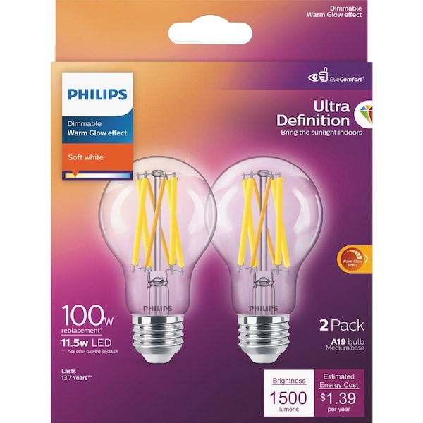 Ultra Definition LED (light emitting diode) A19 dimmable soft-white bulb is specifically designed to provide high quality natural light that helps you see better. Enjoy comfortable full-spectrum light that brings out the true colors and textures of your home. EyeComfort LED bulbs are designed to be comfortable on your eyes with no visible flicker or glare. Get the look and feel of traditional glass incandescent bulbs with the energy-efficient performance of LED. Dims to a cozy warm glow just like traditional incandescent bulbs. Long-lasting beautiful light for up to 15000 hours or up to 15 years with average use. Plastic-free packaging.