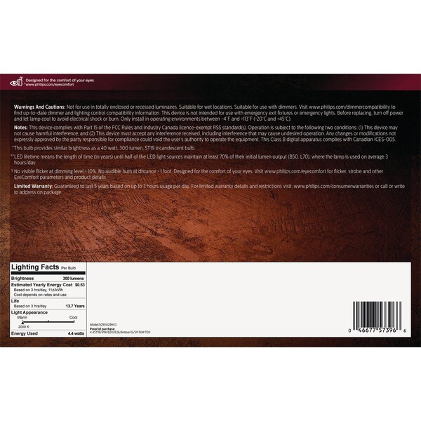 Vintage LED (light emitting diode) amber light bulb that is designed to be seen. This nostalgia-inspired dimmable LED bulb allows you to create an extra cozy ambiance with deep amber tones. Vintage LED bulbs also meet EyeComfort criteria a standard developed to measure products against a set of key factors that can impact the comfort of your eyes. All packaging contains on average more than 8% recycled paper and will further decrease. Dimmable warm glow effect enabling light levels to dim to the warm tones of traditional bulbs. Get the look and feel that you love with the energy-efficient performance of LED bulbs.