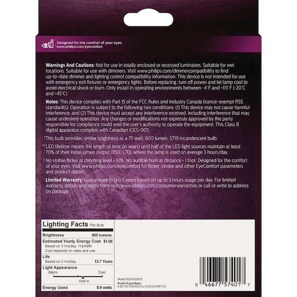 Vintage LED (light emitting diode) clear light bulb that is designed to be seen. This nostalgia-inspired dimmable LED bulb allows you to create a cozy ambiance with soft white tones. Vintage LED bulbs also meet Philips EyeComfort criteria a standard developed to measure products against a set of key factors that can impact the comfort of your eyes. All packaging contains on average more than 8% recycled paper and will further decrease. Dimmable warm glow effect enabling light levels to dim to the warm tones of traditional bulbs. Get the look and feel that you love with the energy-efficient performance of LED bulbs.