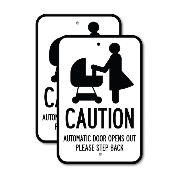 Caution - Automatic Door Opens Out Please Step Back wit, 12'' X 18'', Heavy Gauge Aluminum, 2PK