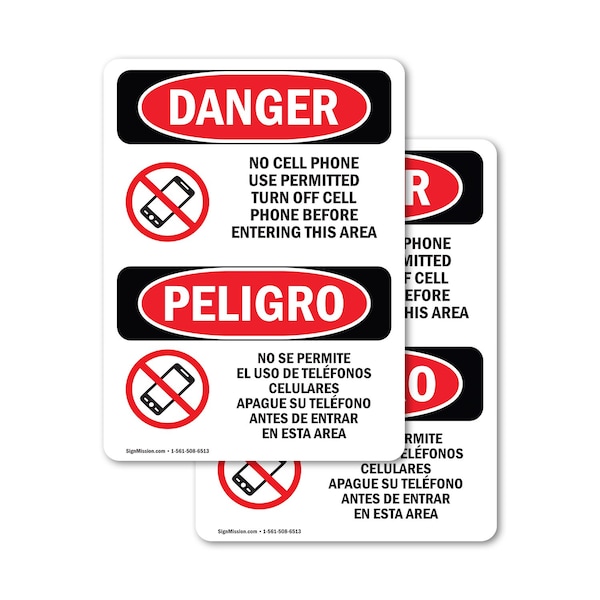 No Cell Phone Use In Area Bilingual, 10 in W x Rectangle, Vinyl Decal