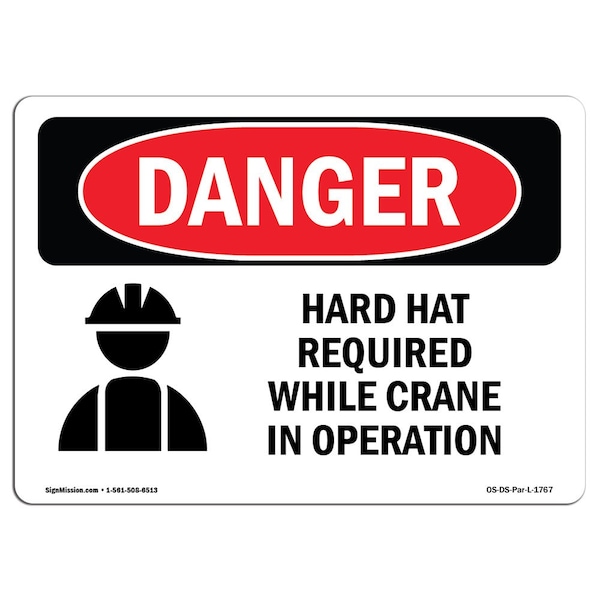 OSHA Danger, Hard Hat Required While Crane In Operation, 10in X 7in Decal, 10" W, 7" H, Landscape