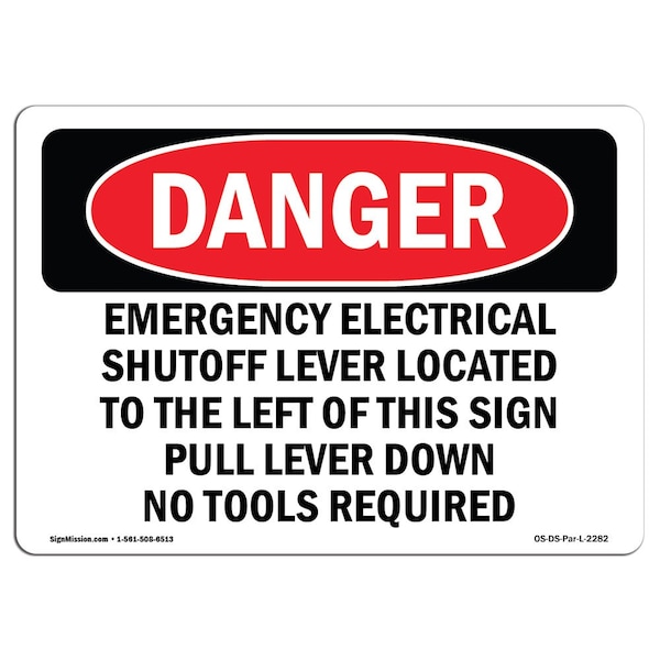 OSHA Danger Sign, 12" Height, 18" Width, Emergency Electrical Shutoff Lever Located, Landscape