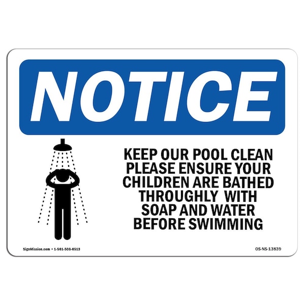 OSHA Notice Sign, 12" H, Aluminum, Keep Our Pool Clean Please Ensure Sign With Symbol, Landscape
