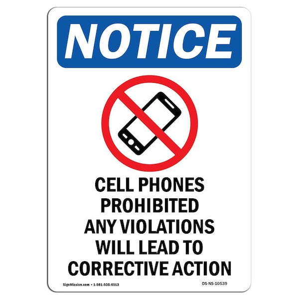 OSHA Notice Sign, 18" Height, Rigid Plastic, Cell Phones Prohibited Sign With Symbol, Portrait