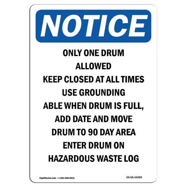 OSHA Notice Sign, 18" Height, Rigid Plastic, Only One Drum Allowed Keep Closed Sign, Portrait