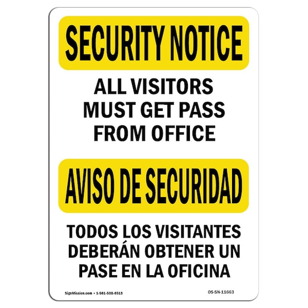 OSHA Security Sign, 10" Height, 14" Width, Visitors Must Get Pass Bilingual, Landscape