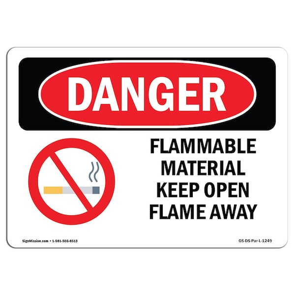 OSHA Sign, 7" Height, 10" Width, Rigid Plastic, Flammable Material Keep Open Flame Away, Landscape