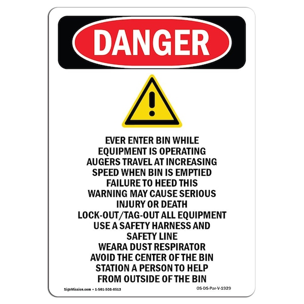 OSHA Sign, Never Enter Bin While, 7in X 5in Decal, 5" W, 7" L, Portrait, Never Enter Bin While