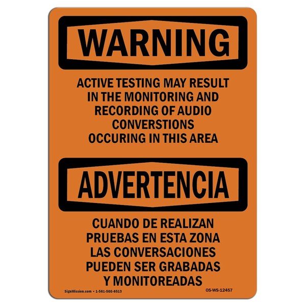 OSHA Warning Sign, 7" Height, Rigid Plastic, Active Testing May Be Monitored Bilingual, Landscape