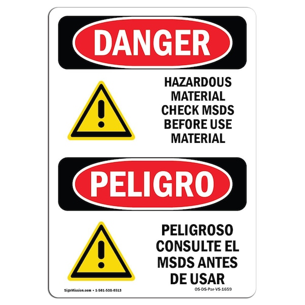 Safety Sign, OSHA, 14" Height, Rigid Plastic, Hazardous Material Check MSDS Spanish