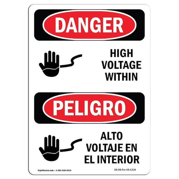 Safety Sign, OSHA Danger, 10" Height, High Voltage Within Bilingual Spanish