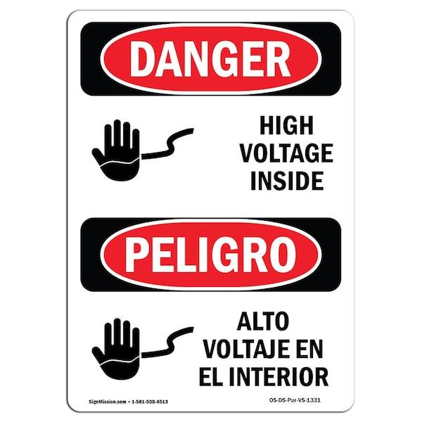 Safety Sign, OSHA Danger, 14" Height, Rigid Plastic, High Voltage Inside Spanish