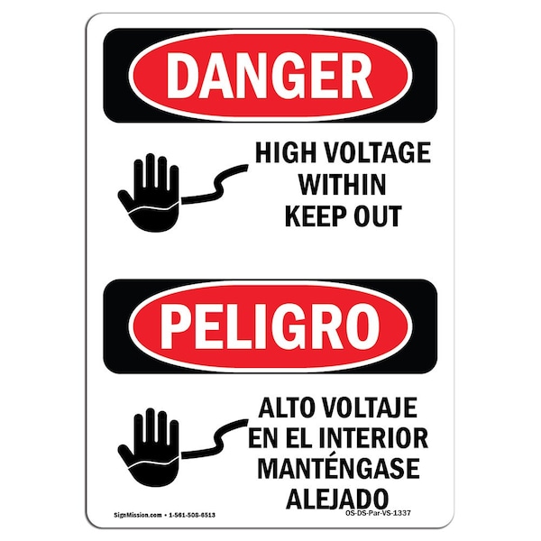 Safety Sign, OSHA Danger, 14" Height, Rigid Plastic, High Voltage Within Keep Out Spanish