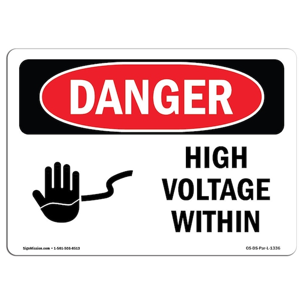 Safety Sign, OSHA Danger, 3.5" Height, 5" Width, High Voltage Within, Landscape