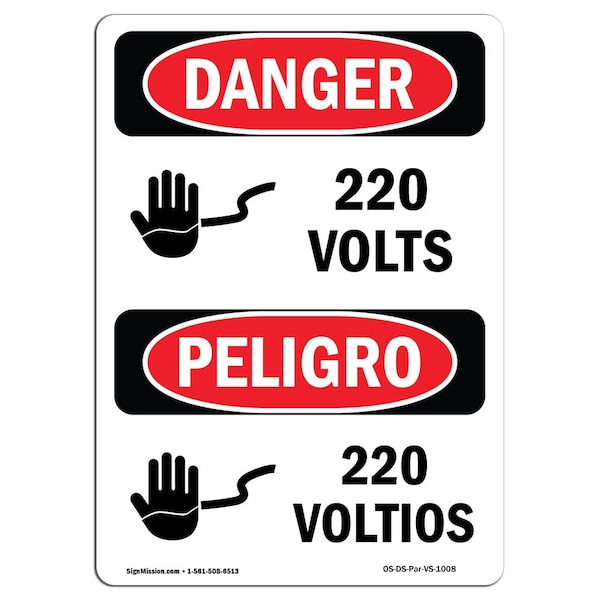 Safety Sign, OSHA Danger, 5" Height, 220 Volts, Bilingual Spanish
