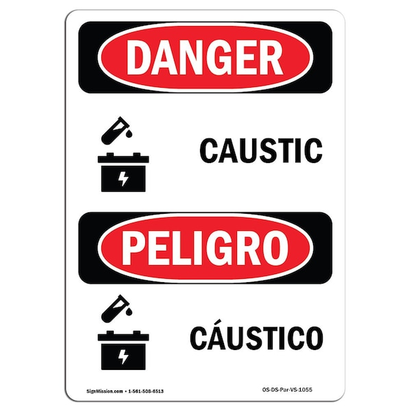 Safety Sign, OSHA Danger, 5" Height, Caustic, Bilingual Spanish