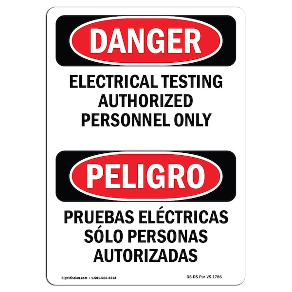 Safety Sign, OSHA Danger, 5" Height, Electrical Testing Bilingual Spanish