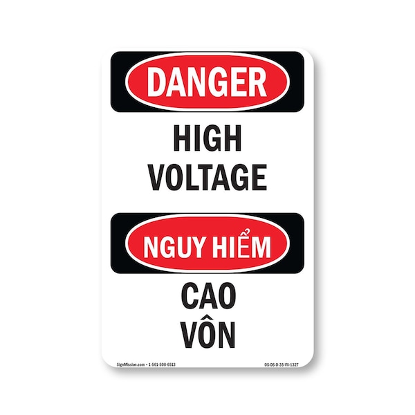 Safety Sign, OSHA Danger, 5" Height, High Voltage Bilingual