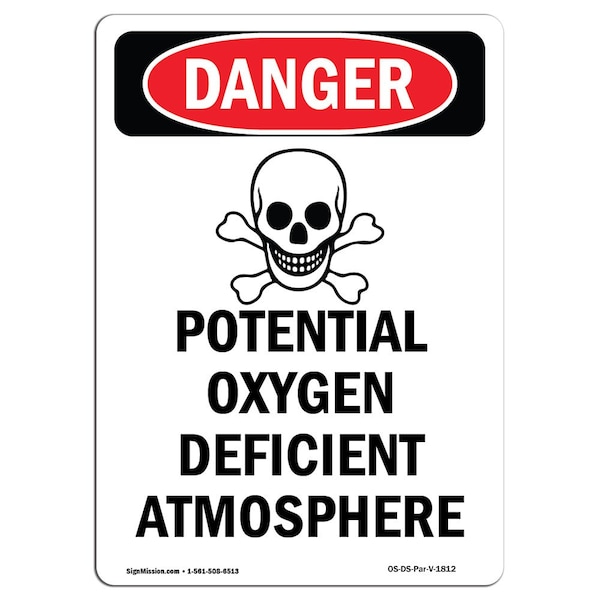 Safety Sign, OSHA Danger, 5" Height, Potential Oxygen Deficient, Portrait