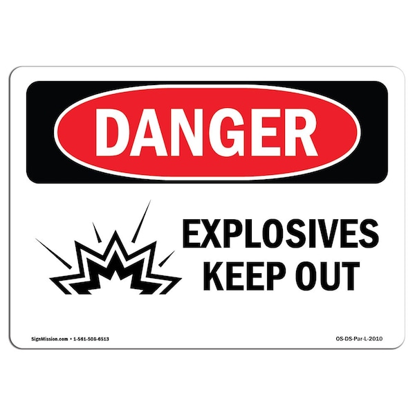 Safety Sign, OSHA Danger, 7" Height, 10" Width, Explosives Keep Out, Landscape