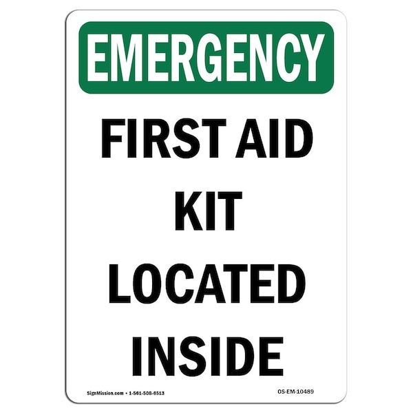 Safety Sign, OSHA EMERGENCY, 10" Height, First Aid Kit Located Inside, Portrait