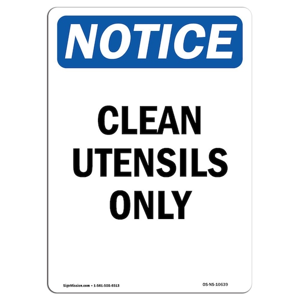 Safety Sign, OSHA Notice, 5" Height, Clean Utensils Only Sign, Portrait, 10PK