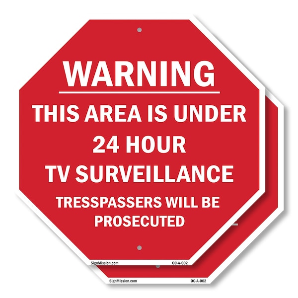 Warning This Area Is Under 24 Hour, 10 inch X 10 inch, Plastic Sign, 2PK
