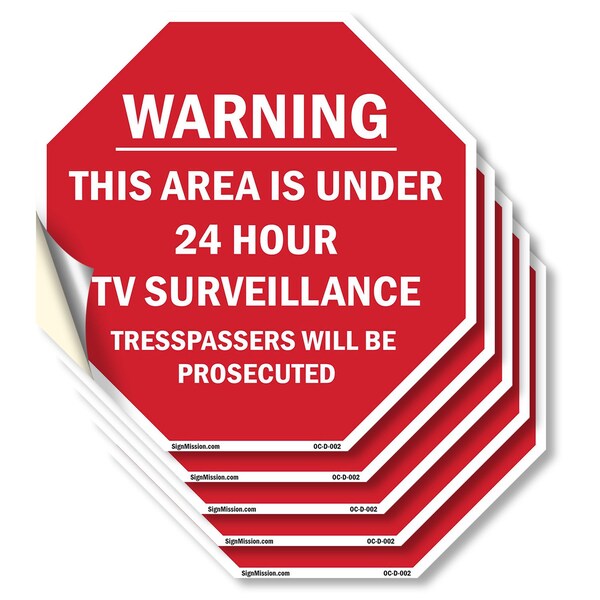 Warning This Area Is Under 24 Hour, 6 inch X 6 inch, Vinyl Decal, 5PK