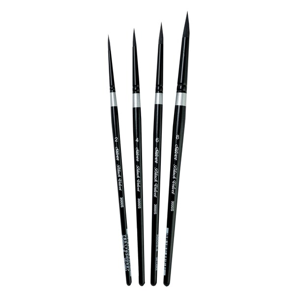 Silver Brush Black Velvet brushes were created for watercolor artists and skilled hobbyists. Each Black Velvet brush is soft enough to add color without disturbing previous layers but firm enough to lift color when needed. Black Velvet professional watercolor brushes are expertly crafted with a luxurious blend of the softest squirrel hair and black synthetic fibers. Each brush has a short handle that is finished with sophisticated black lacquer. This set of watercolor brushes has 4 round brushes of varying sizes. Silver Brush round paint brushes are ideal to use when creating precise, detailed work. Each round paintbrush can create thin lines, fine details, dots, and scrollwork. Silver's Black Velvet brushes are best paired with watercolor. Each brush will hold the right amount of color, giving you more time to focus on your masterpiece. Watch your ethereal creations come to life with Silver Brush premium-quality brushes. Use Black Velvet for all watercolors, gouache, liquid acrylics, fluids, silk dyes and inks. Paint portraits, flowers, botanical art, still life. Enjoy the experience of the finest quality artist brush. In your studio, class or plein air.