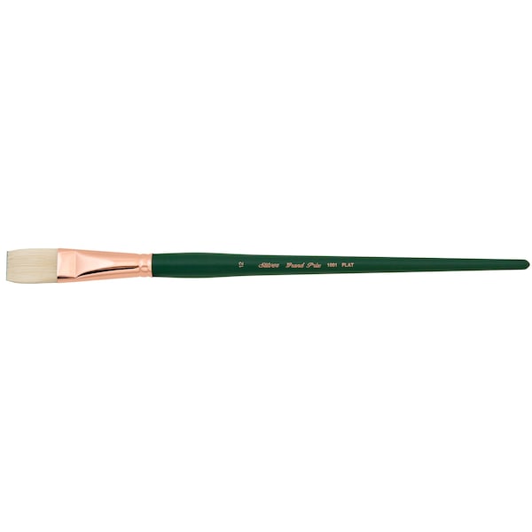 The Silver Brush Grand Prix line has been used to paint political portraits, including US Presidents and First Ladies. Each brush has excellent paint-holding capabilities and is well balanced. This line offers brushes with interlocking bristles and natural flags. Grand Prix professional brushes are expertly crafted with elite-quality hog bristle. Each brush has a long matte-green handle that reduces glare and is finished with a sophisticated, corrosion-resistant, copper ferrule. The loose stroke control, flat-head brushes are superior tools to use when creating landscapes and backgrounds. Flat brushes can also design thin lines and broad stokes. The long handle is ideal for easel canvas painting.
