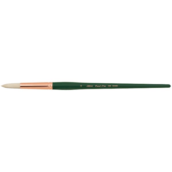 The Silver Brush Grand Prix line has been used to paint political portraits, including US Presidents and First Ladies. Each brush has excellent paint-holding capabilities and is well balanced. This line offers brushes with interlocking bristles and natural flags. Grand Prix professional brushes are expertly crafted with elite-quality hog bristle. Each brush has a long matte-green handle that reduces glare and is finished with a sophisticated, corrosion-resistant, copper ferrule. The round art brushes are superior tools to use when creating detailed work that needs precision. Each round paintbrush can also design thin lines and broad stokes. The long handle is ideal for easel canvas painting.