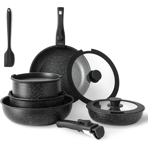 Simple Deluxe 12 Pcs Nonstick Cookware Sets, Pots and Pans Set, Black Granite Induction Cookware with Detachable Handle, Oven Safe, PFAS and PFOA Free, Black