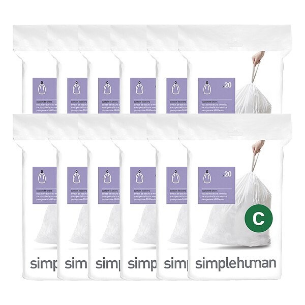 Capacity 3 gal, Thickness 0.98 mil, Color White, Bag Closure Type Drawstring, Height 20 1/8 in, Max. Load 39 lb, Bottom Seal Type Flat, Scent Fragrance Free, Legend Plastic Caution, Simplehuman Logo, Package Configuration Interleaf, Bags per Roll 360, Item Custom Fit Trash Bags