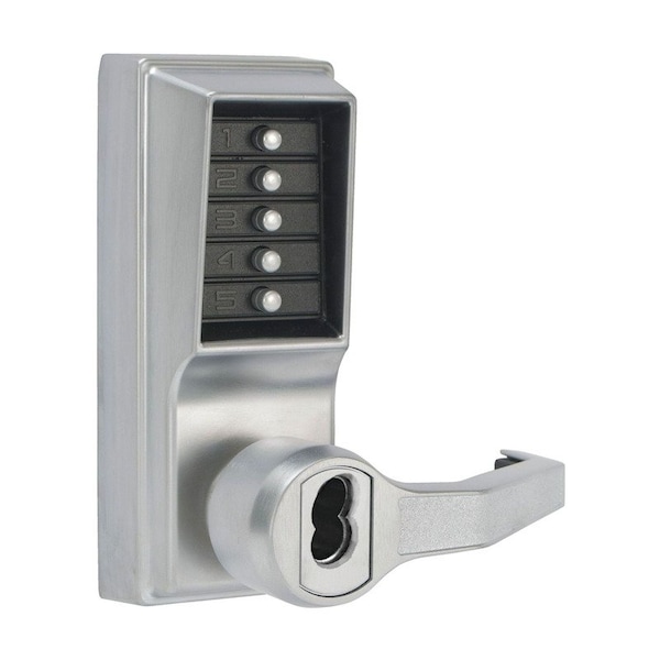 Simplex mechanical pushbutton locks offer a convenient way to control access between public and private areas. There are no keys or cards to manage, no computers to program, no batteries to replace, and combinations can be changed in seconds without removing the lock from the door. Kaba Right Hand Mechanical Pushbutton Lever Lock Combination; Privacy; and Key Override; Schlage Prep; 2-3/4in Backset; and 3/4in Throw Satin Chrome Finish.