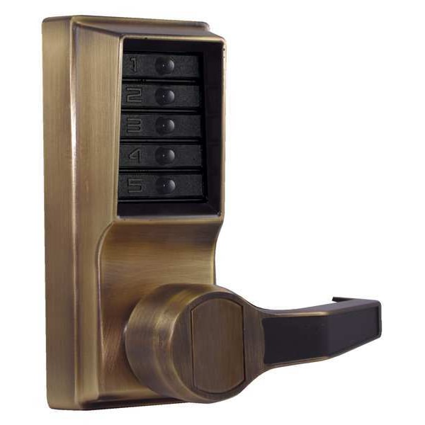 Mechanical Push Button Lockset, Handle Type Lever, Function Entry/Passage, Key Override Options None, Hand Right, Finish Antique Brass, Door Thickness 1-3/8 in to 2-1/4 in, Keypad 5 Button, Vandal Resistant, Backset 2 3/4 in, ADA Compliant Yes, 3 hr Fire Rated, Case Material Zinc, Series L1000, Latch Length 1/2 in, Max. User Codes 1, Standards UL/cUL Listed, Weather Resistant Yes, Includes Access Key, Code Change Plug, Lock, Template, Mechanical