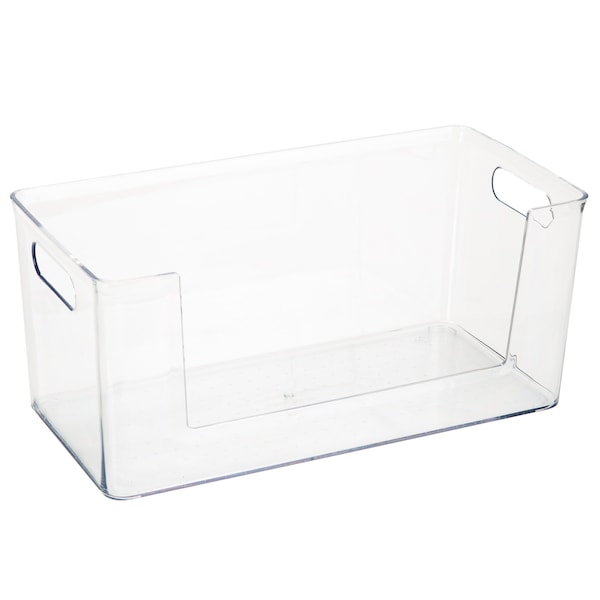 The Simplify Rectangular Open Front Organizer Bin is the best storage and organization solution. It is the perfect size for kitchen and bathroom storage. You can store pantry food items such as jars and bottles. Or you can keep it in your bathroom to hold soaps, cosmetics, and hand towels. The clear design makes items inside visible and easy to find. The open front makes it easy to grab what you need quickly without having to take the bin off the shelf. The handles make it easy to transport. You can keep this transparent storage bin on your desktop or countertop surface because it fits with any rooms dcor. You need this bin to help you organize your home!