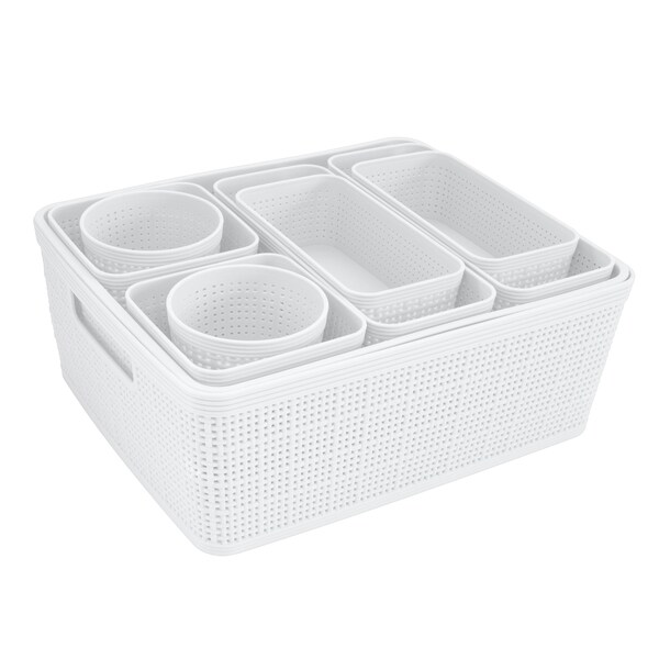 - •Set Includes: 2 Round Baskets: 4"x 4"x 2.5" , 2 Square Baskets: 5"x 5"x 2.5", 2 Rectangular Baskets: 7"x 4"x 2.5", 2 Rectangular Baskets: 10"x 4"x 2.5", 1 Large Rectangular Basket: 14"x 11"x 5", 1 Large Rectangular Tray: 14"x 11"x 2.5"