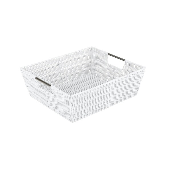 Organize and create storage in your home with the Simplify Rattan Tote Basket Collection. Simplify's Rattan Tote is a PE Basket with an iron frame and 2 sturdy stainless steel carry handles. It is strong anddurableprolonging it's life, and it's lightweight design makes it easy to lift and carry. Fits anyhome decor with it's wide selection of colors. Store your household belongings and organize space with these stylish baskets. Stack them together in a corner of your craft area, home office or Dorm to keep your essentials close at hand in an organized manner.