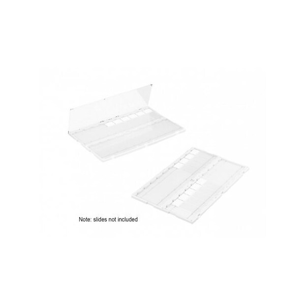 Slide Folder holds up to twenty standard microscope slides 75mm x 25mm (3"x1"). Ideal system stores and displays individual slides horizontally. Transparent front panels allows quick and convenient viewing of contents. Slides are easily removed by pressing on one end, as opposite end automatically lifts. Front panels fold behind base for additional space saving purposes. Low profile folders are stackable, take minimum space, and temperature resistant from -80°C to +100 °C.