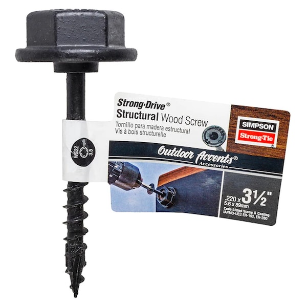 Simpson Strong-Tie SDWS22312DBB-RN1 3-1/2in Outdoor Accents Structural Screw w/ Hex Head Washer 1ctExterior Wood ScrewsThe Outdoor Accents structural screw reduces installation time by driving easily without predrilling. When combined with the patented, load-rated Outdoor Accents hex-head washer, the solution delivers the decorative appearance of a bolt connection but with a much easier installation. The screwfts bold thread design enables superior holding to attach ledgers and other secure connections.Key FeaturesUse with Outdoor Accents decorative hardware and hex-head washerfor an appealing lookUse Outdoor Accents structural screw without the washer as a wood-to-wood fastenerSawTooth, point ensures fast starts, reduces installation torque and eliminates the need for predrilling in most applicationsDeep 6-lobe T40 recess provides easy, secure driving T40 drive bit included in multi-count packagesBlack double-barrier coating offers premium look while providing a medium level of corrosion protection for many outdoor applicationsProduct IncludesSingle-count SKUs SDWS22312DBB-RN1, SDS22512DBB-RN1 include the Outdoor Accents hex-head washer STN22Multi-count SKUs include 6-lobe driver bitFinishDouble-barrier black proprietary coating Specifications: Coating/MaterialDouble-Barrier CoatingLength in.3 1/2Head Diameter in.0.750Shank Diameter in.0.220Drive TypeT40 6-LobeHead TypeLow Profile HeadThread Length in.2Point TypeSawTooth, PointColorBlackPackaging Qty.1Carton Qty.20