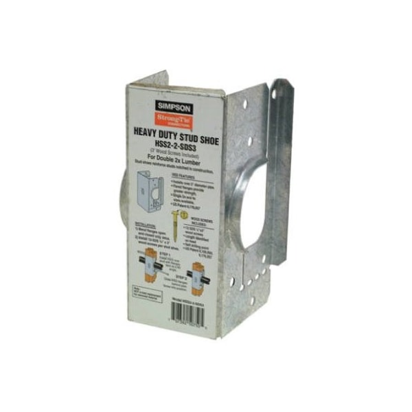HSS22SDS3, Stud Shoe With 3 Screws, Reinforce Studs Notched In Construction, Made For Use On Double 2 x Studs, Easy To Use Flanges Can Be Bent To 90 Degree During Installation Then Bent Back For Fastening, Provide Tension Load Capacity As Well As Increased Compression Loads, Flared Flange Provides Greater Strength, Installs Over Pipe Up To 238 Outside Diameter, Install With 12SDS14 x 3 Screws