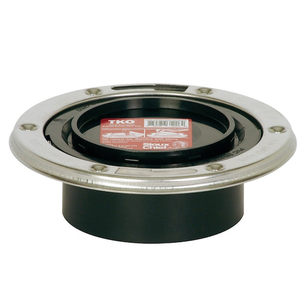 This TKO 4 inch spigot, flush to floor ABS total knockout closet flange offers easier installation, and there's no need to hold knockout while hammering. Strong, corrosion-resistant stainless steel ring eliminates cracked flanges.