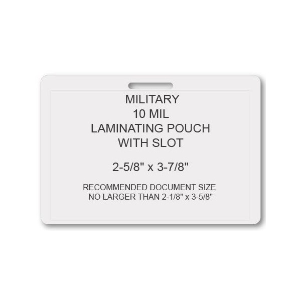 SircleLam® 10 Mil Military Size w/Slot Laminating Pouches are heavy-duty pouches designed specifically for military sized ID's and Badges. These pouches have a thickness of 10 mil, providing added durability and protection for your important documents. Each box contains 100 pouches, making it convenient and cost-effective for large-scale laminating projects. The pouches also feature a slot for easy insertion and removal of documents, allowing for quick and efficient laminating. These laminating pouches are ideal for preserving and protecting military documents, ID cards, badges, and other important items that require extra security and longevity. Trust SircleLam® for high-quality laminating solutions for all your professional needs.