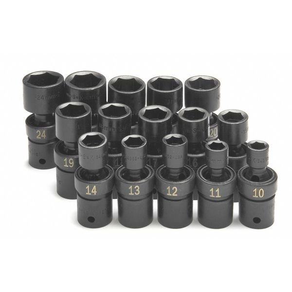 (15) 1/2" Drive Swivel Impact Socket: 10mm, 11mm, 12mm, 13mm, 14mm, 15mm, 16mm, 17mm, 18mm, 19mm, 20mm, 21mm, 22mm, 23mm, 24mm; Molded Plastic Case